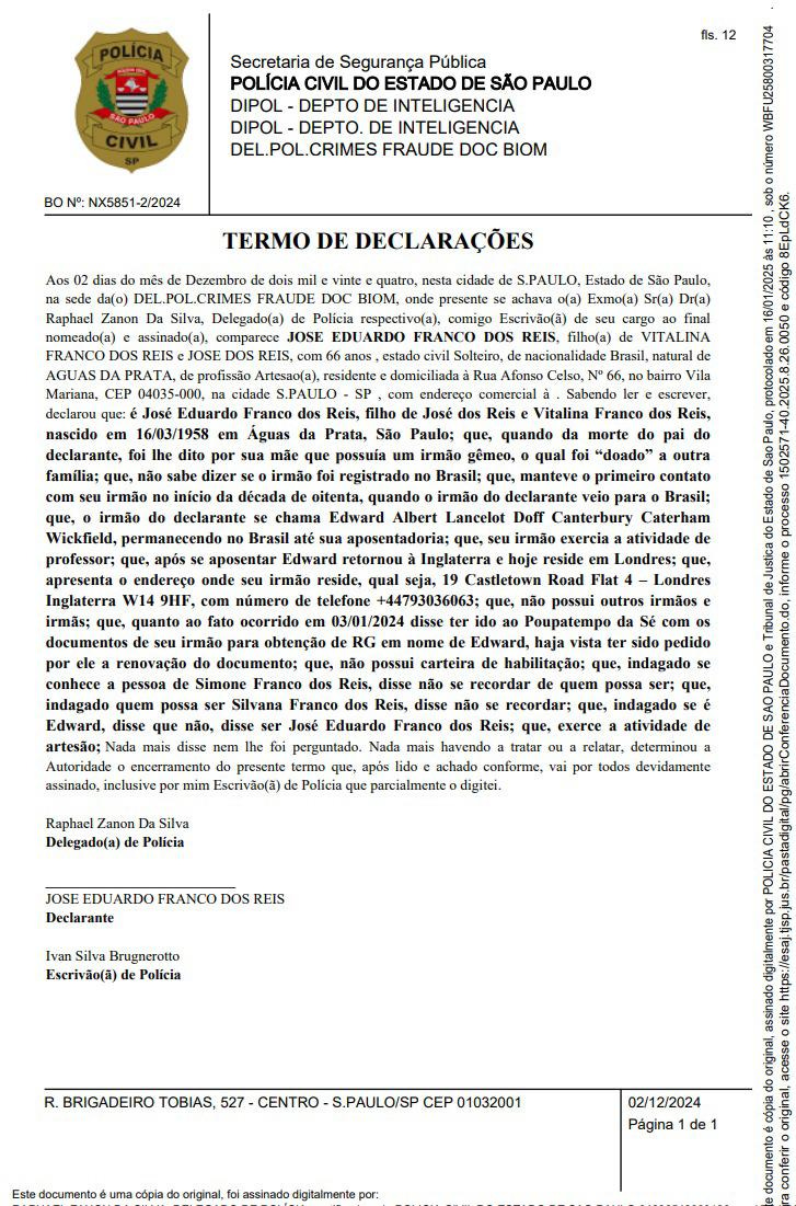 Só não conseguiu enganar o Poupatempo da Sé, ao tentar obter, em 3 de outubro de 2024, uma segunda via de sua cédula de identidade como Edward. Com os modernos recursos da biometria, o sistema cruzou dados e verificou que as impressões de Edward e José Eduardo eram as mesmas.